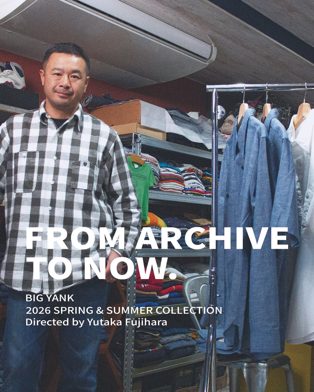 FROM ARCHIVE TO NOW.Directed by Yutaka Fujihara-BIG YANK 2026SSコレクションを徹底解説- オリジナルを知らずして、再現はできない。本コレクションは、現存するヴィンテージアーカイブを基に、細部に至るまで徹底的に検証されている。縫製仕様、ステッチピッチ、生地の風合い、縮率。すべてを分解し、再構築する。単なる“それらしく見せる復刻”ではない。本質に迫るための検証と設計である。 2026年春夏コレクションよりディレクションを務める、藤原裕。 今シーズンは、1942年に生まれたBIG YANKを象徴するディテール「山ポケット」を軸に、自身が本当に着たいと思えるプロダクトを再構築。 定番のシャンブレーシャツをはじめ、本人所有のヴィンテージをベースにしたヘリンボーン、そして市場でも希少価値が高まるネルシャツ。さらに、それらのシャツに合わせるためのチノパンツや"夏の定番"となるような半袖仕様までを展開。 すべては、BIG YANKというブランドの本質を踏まえながら、現代において“リアルに機能するワークウェア”として再設計されている。 これは単なる復刻ではない。藤原裕の視点を通して再編集された、ひとつの「MY BIG YANK」である。 Y1942 CHAMBRAY SHIRT BIG YANKを象徴する、1942年の山ポケット。 このシャンブレーシャツは、1942年に生まれたBIG YANKの代表的なディテール「山ポケット」を軸に、自身が本当に着たいバランスへとアップデートした一着です。 最大の特徴は、やはりこの山型ポケット。そしてもうひとつが、袖口のストームカフス。労働時の可動性を考えて設計されたこの仕様は、現代においては“袖を自然にまくれる”機能として活きています。 今回は、自身のスタイルに合わせて細部を再設計。オリジナルでは緑のカンヌキを、水色へ変更。デニムとの相性を考えた、意図的なアップデートです。 背面のアーチ状のヨークや全体のバランスは踏襲しながら、着丈やネック周りを調整し、より自然に着られるフィットへと仕上げています。 ▶Y1942 CHAMBRAY SHIRT を見る Y1942 S-SLEEVE CHAMBRAY SHIRT 究極の半袖シャンブレーシャツ。 ベースとなるのは、1942年モデルのディテール。“夏に着るためのBIG YANK”として再構築しています。 単に袖を切っただけでは成立しないのが、ワークウェアです。袖丈、バランス、身頃との関係性。長袖の設計思想を崩さずに、半袖として成立させるための再設計を行っています。袖口はヴィンテージ好きにはわかる、先三つ巻き仕様です。 オリジナルを尊重しながら、現代の着用シーンに合わせてアップデートする。これは復刻ではなく、新たに定義されたBIG YANKの一形態です。 ▶Y1942 S/S CHAMBRAY SHIRT を見る Y1944 HBT SHIRT 着込むことで完成する、ヘリンボーン。 このモデルは、1940年代中期のBIG YANKをベースに、ヘリンボーン素材で再構築した一着です。最大の特徴は、このネイビーの色合い。ヴィンテージ特有の“ナス紺”へと変化していく過程を見据え、生地の段階から選定されています。ベースにしたのは、藤原裕本人が所有するオリジナル。長年着こむことで生まれる、あの独特なフェード感を再現するための設計です。着始めが完成ではない。時間とともに色が抜け、表情が変わり、自分だけの一着へと育っていく。BIG YANKの本質である“経年変化”を、最も体感できるヘリンボーンシャツです。 ヴィンテージのフィッティングを踏襲した広めの肩幅と太めの袖を再現したオーバーサイズシルエットで設計されているので、ワークウェア特有の無骨さと抜け感が共存するバランスに仕上がります。 ▶Y1944 HBT SHIRT を見る Y1943 L/W HBT SHIRT 上品に着たい白のワークシャツ。 このモデルは、藤原裕自身が日常的に着る“白シャツ”の感覚を、山ポケット仕様へと落とし込むことで生まれました。ネイビーのモデルと同様、山ポケットやストームカフスといったディテールは受け継ぎながら、素材はあえて軽やかなライトウェイトのヘリンボーンを採用。ワークウェアでありながら、どこかクリーンで洗練された印象を持つ仕上がりです。軽めのデニムやチノと合わせることで、無骨さと上品さが同居するスタイルを作ることができます。これは復刻ではなく、BIG YANKの新たな可能性として提案する一着です。 ▶Y1943 L/W HBT SHIRT を見る Y1945 FLANNEL SHIRT BLOCK CHECK WHITE 最も象徴的な配色を、最も希少なディテールで。 BIG YANKの中でも、特に希少性の高い“山ポケット仕様のネルシャツ”。その中でも、普遍的な魅力を持つ白黒のブロックチェックで構成した一着です。ヴィンテージ市場においても、40年代のネルシャツは年々数を減らし、いまや簡単に出会えるものではありません。中でもこの山ポケ仕様は、極めて限られた存在です。ディテールは、山ポケット、ストームカフス、ダブルステッチの襟と、当時の設計を忠実に再現。素材には、着込むことで自然なフェードが生まれるネルを採用しています。白黒というシンプルな配色だからこそ、着込むことで生まれる表情の変化が際立